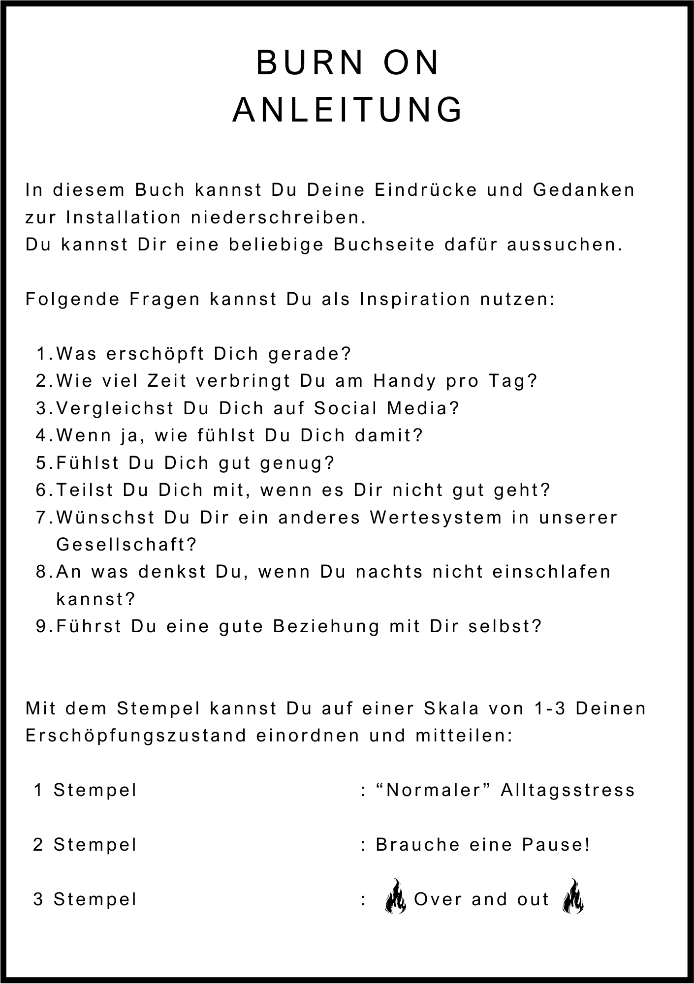 In einem beiligenden Buch können die Besuchenden ihre Gedanken zum Thema anonym niederschreiben, eine Reihe vorgegebener Fragen beantworten sowie ihren Erschöpfungszustand von einer Skala 1 - 3 mit einem Feuerlöscherstempel abstempeln.